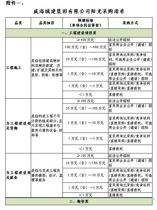 附件一:威海城建集團(tuán)有限公司陽光采購(gòu)清單