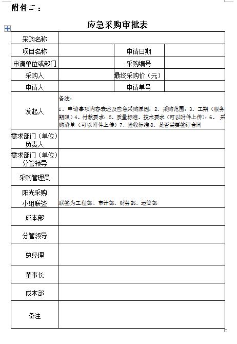 2.工作流程:需求部門(單位)提報(bào)《采購(gòu)申請(qǐng)表》,按規(guī)定程序?qū)徟ㄟ^后,由成本部委托招標(biāo)代理機(jī)構(gòu)具體實(shí)施。
