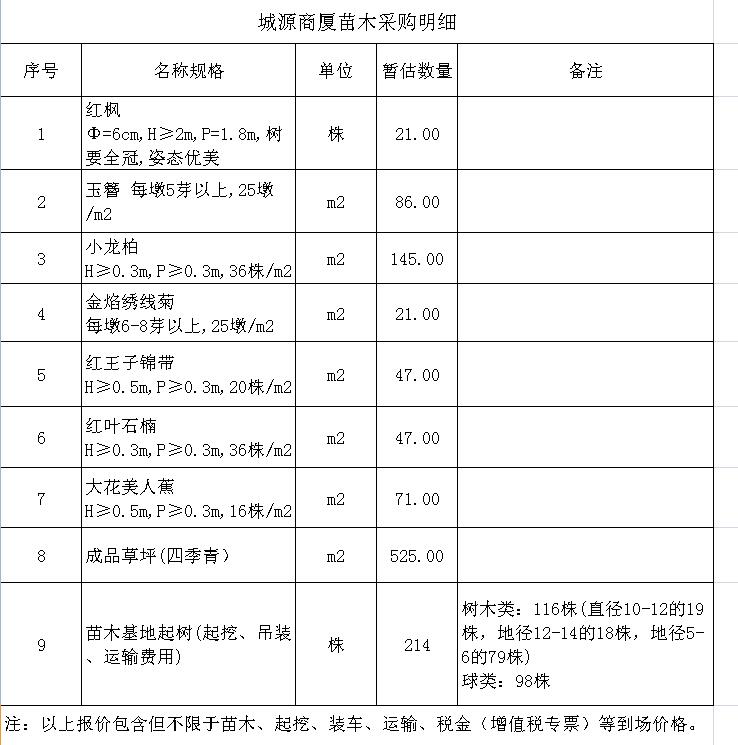 (4)采購(gòu)內(nèi)容:城源商廈項(xiàng)目綠化苗木的采購(gòu)及苗木基地樹苗的起挖、裝車并運(yùn)輸?shù)焦さ刂付ǖ攸c(diǎn),采購(gòu)清單詳見附件。